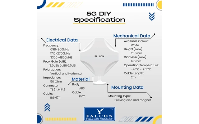 Con la soluzione portatile fai-da-te 5G/LTE per roulotte e camper, potrete usufruire di Internet senza dovervi affidare al Wi-Fi a pagamento di un campeggio. Grazie alla ventosa e al supporto in dotazione, il posizionamento dell’antenna Falcon DIY è estremamente flessibile.