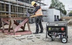 Sia per applicazioni commerciali che municipali: Spesso non c’è alimentazione elettrica sul posto. Con il nostro potente generatore sincrono PGG 8/3 a benzina, questo problema è rapidamente risolto. Grazie alle ruote antiforatura e alla barra di spinta pieghevole, è facile da trasportare e manovrare sul posto. Il serbatoio da 25 litri assicura lunghe ore di lavoro fino a 7 ore (fino a 5,5 ore a piena potenza), l’affidabile motore a benzina a 4 tempi (EU STAGE V) una potenza costante di 7 kW. Con 2 prese a terra (AC) e una presa rossa da 400 volt (trifase, trifase), offre molte opzioni di connessione per le vostre attrezzature. Il regolatore automatico di tensione (AVR) permette anche il funzionamento di dispositivi elettronici sensibili. Dettagli sensati dell’attrezzatura, come la protezione da sovraccarico e da olio basso, così come un robusto telaio in acciaio tubolare proteggono in modo affidabile l’utente e la macchina da qualsiasi rischio o danno