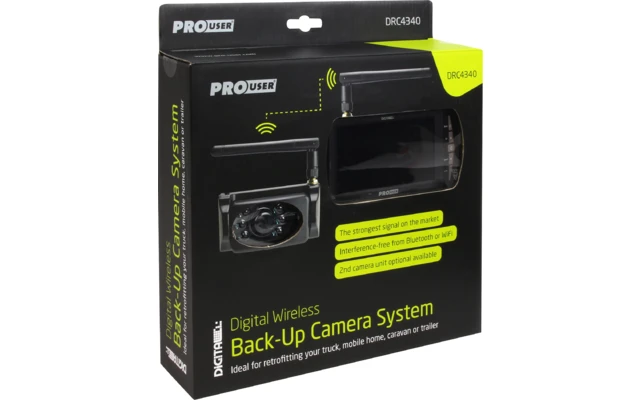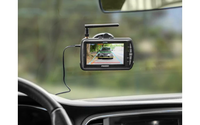 monitor LCD a colori da 4,3″ con linee guida di distanza sovrapponibili. radio digitale a 2,4 GHz con antenna esterna, portata fino a 50 metri senza interferenze da WiFi o Bluetooth. Montaggio della telecamera con la staffa di montaggio in dotazione. Espandibile.