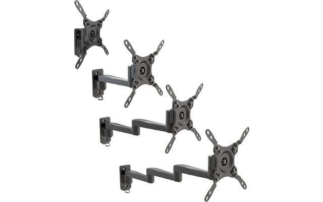 La staffa a muro è appositamente progettata per le roulotte. La staffa può essere assemblata come richiesto e può essere usata come una staffa a muro a 1, 2 o 3 braccia. La staffa può essere bloccata in modo che il televisore non possa muoversi durante il viaggio. Design molto stabile per TV fino a 13 kg. Le canaline assicurano la posa ordinata del cavo coassiale.