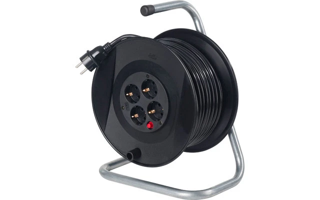 Tamburo per cavi per uso interno in plastica speciale robusta e altamente resistente alla rottura, base robusta e zincata che assorbe gli urti, freno di bloccaggio, interruttore di protezione termica VDE con funzione automatica e 4 prese di contatto di protezione